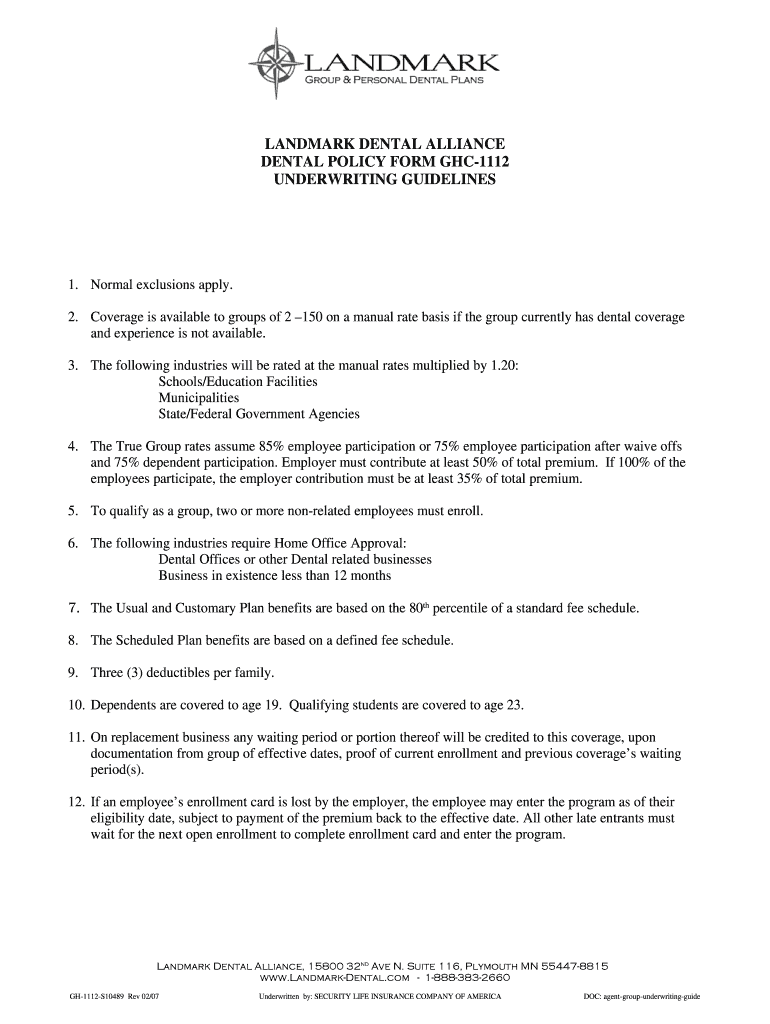 LANDMARK DENTAL ALLIANCE DENTAL POLICY FORM GHC1112 UNDERWRITING GUIDELINES 1. Normal exclusions apply. 2. Coverage is available to groups of 2 150 on a manual rate basis if the group currently has