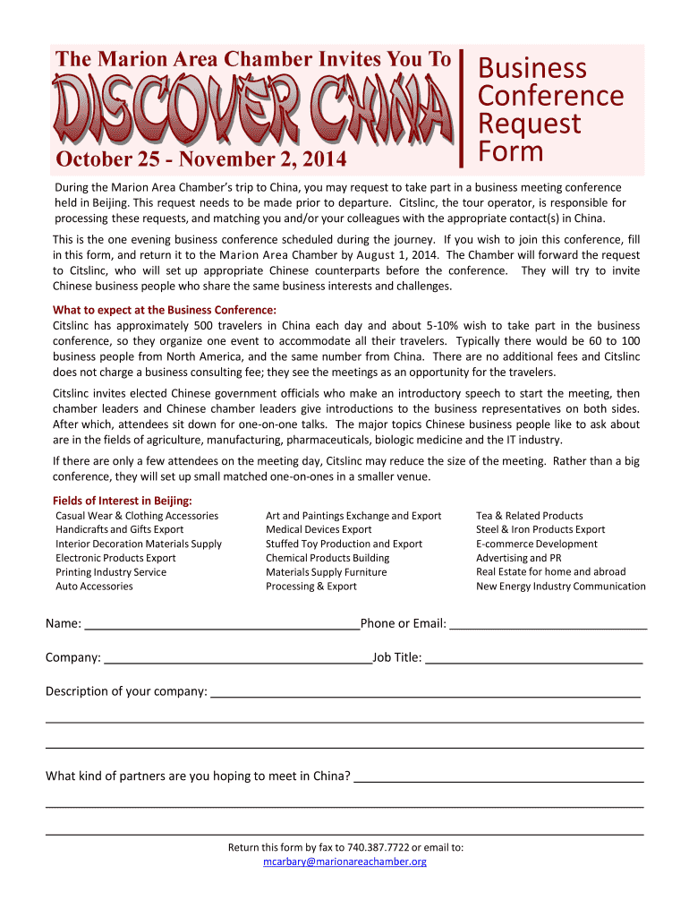 During the Marion Area Chambers trip to China, you may request to take part in a business meeting conference
