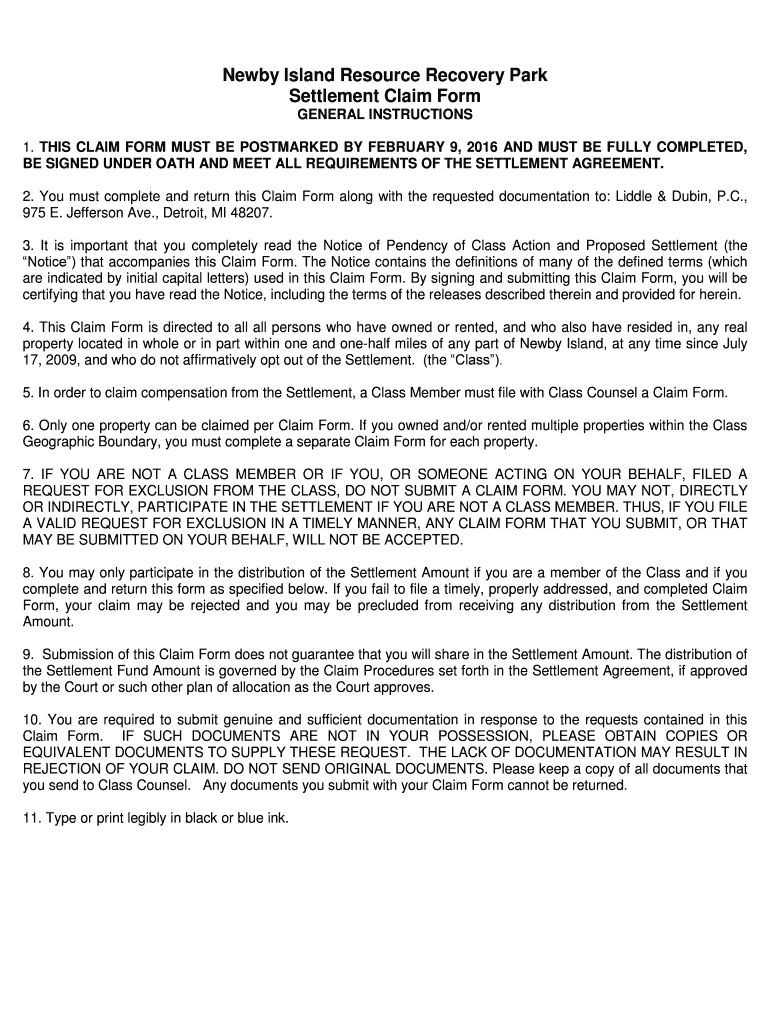 Newly Island Resource Recovery Park Settlement Claim Form GENERAL INSTRUCTIONS 1. THIS CLAIM FORM MUST BE POSTMARKED BY FEBRUARY 9, 2016, AND MUST BE FULLY COMPLETED, BE SIGNED UNDER OATH AND MEET
