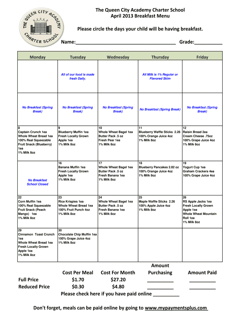 The Queen City Academy Charter School April 2013 Breakfast Menu Please circle the days your child will be having breakfast. Name: Grade: Monday Tuesday Wednesday All of our food is made fresh Daily.