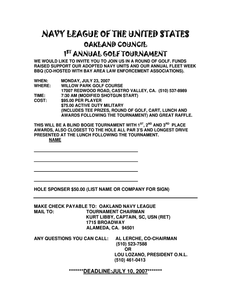 NAVY LEAGUE OF THE UNITED STATES OAKLAND COUNCIL 1ST ANNUAL GOLF TOURNAMENT WE WOULD LIKE TO INVITE YOU TO JOIN US IN A ROUND OF GOLF. FUNDS RAISED SUPPORT OUR ADOPTED NAVY UNITS AND OUR ANNUAL FLEET
