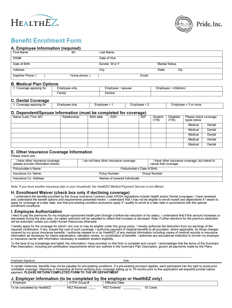 Benefit Enrollment Form A. Employee Information (required) First Name: MI: Last Name: SSN#: Date of Hire: Date of Birth: Gender: M or F Marital Status: Address: City: State: Daytime Phone: () Home