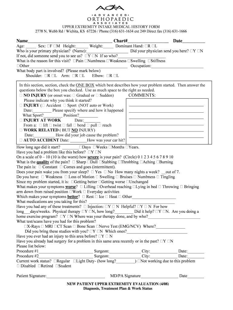 Get the free UPPER EXTREMITY INTAKE MEDICAL HISTORY FORM