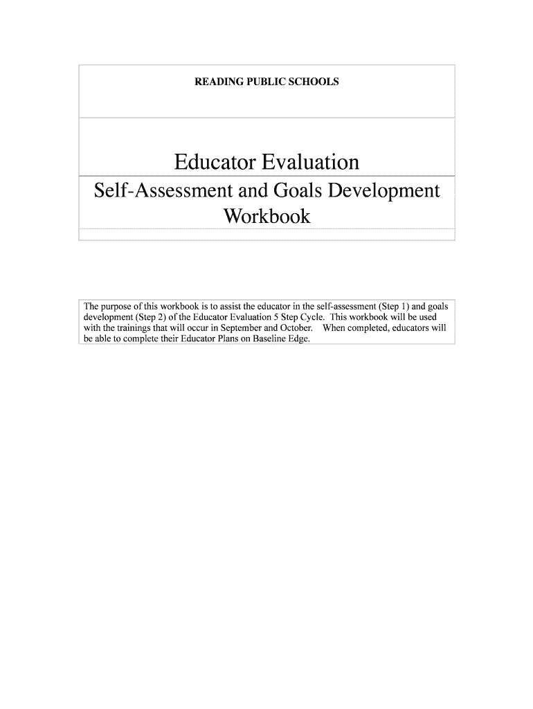 READING PUBLIC SCHOOLS Educator Evaluation Reassessment and Goals Development Workbook The purpose of this workbook is to assist the educator in the self assessment (Step 1) and goals development