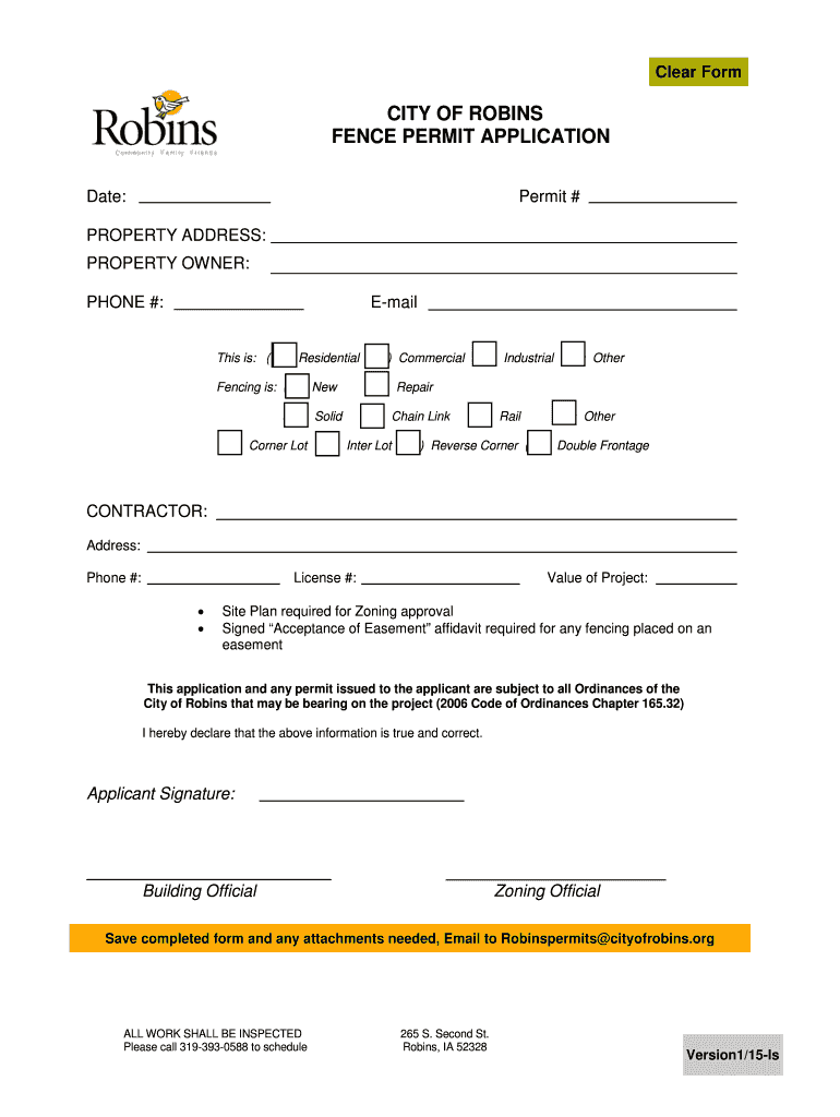 Clear Form CITY OF ROBINS FENCE PERMIT APPLICATION Date: Permit # PROPERTY ADDRESS: PROPERTY OWNER: PHONE #: Email This is: () Residential (Fencing is: ((() New) Solid) Corner Lot ((() Commercial