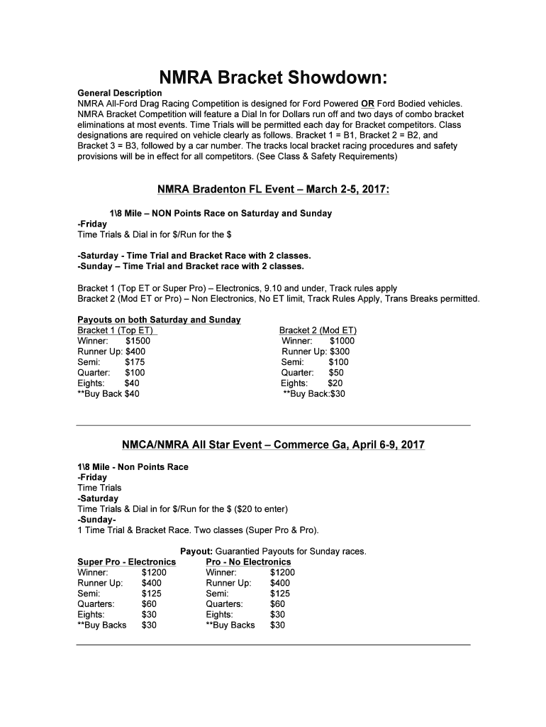 NMRA Bracket Showdown: General Description NMRA Alford Drag Racing Competition is designed for Ford Powered OR Ford Bodied vehicles. NMRA Bracket Competition will feature a Dial In for Dollars run