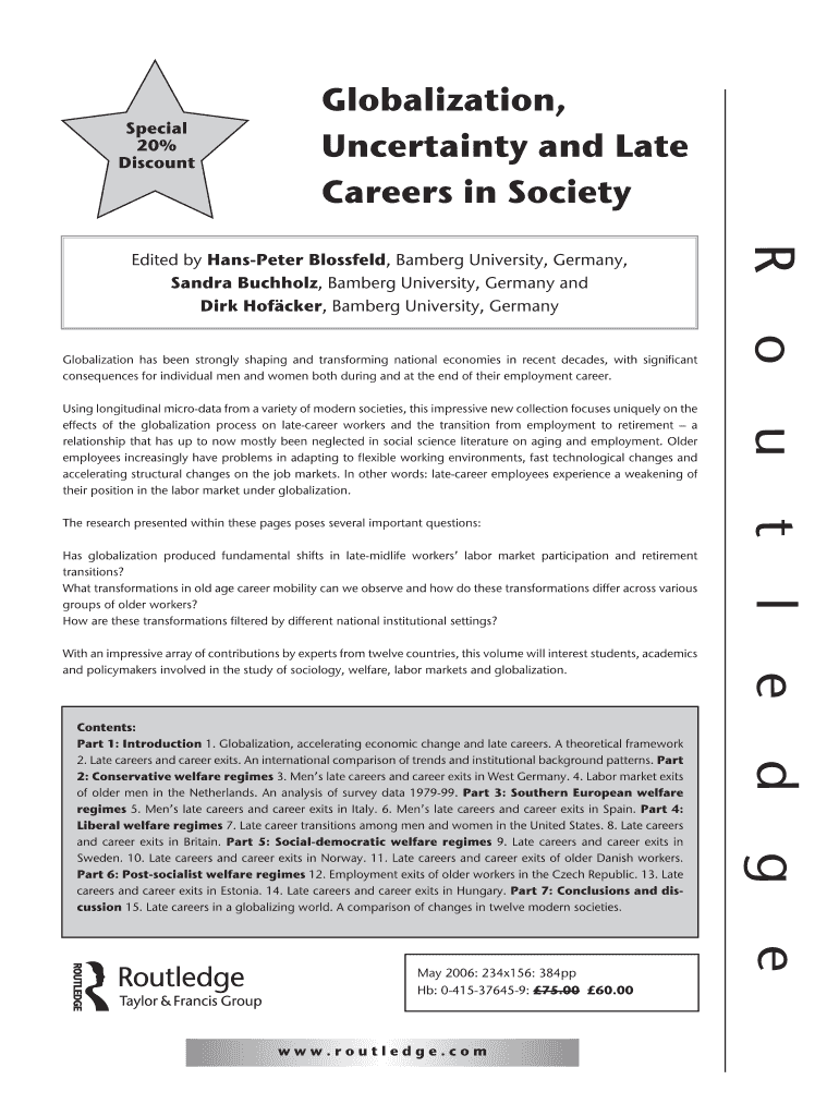 Special 20% Discount Globalization, Uncertainty and Late Careers in Society e www.routledge.com g May 2006: 234×156: 384pp He: 0415376459: 75.00 60.00 d Contents: Part 1: Introduction 1. Globalization,