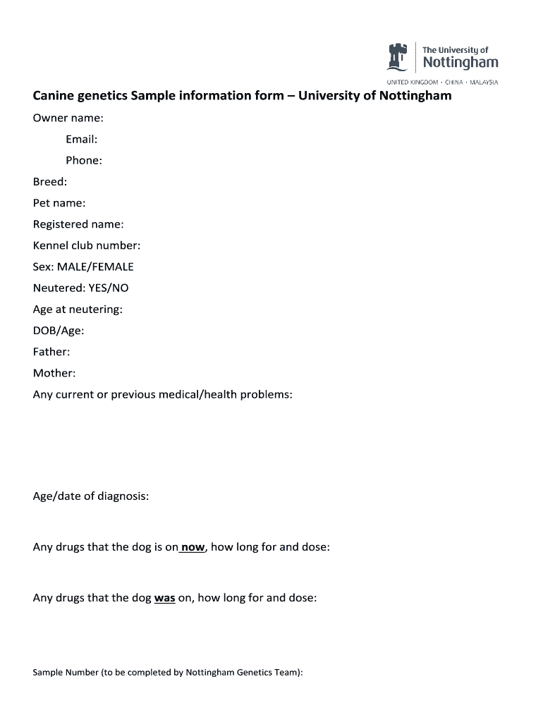 Canine genetics Sample info information form University of Nottingham Owner name: Email: Phone: Breed: Pet name: Registered name: Kennel club number: Sex: MALE×FEMALE Neutered: YES×NO Age at neutering: