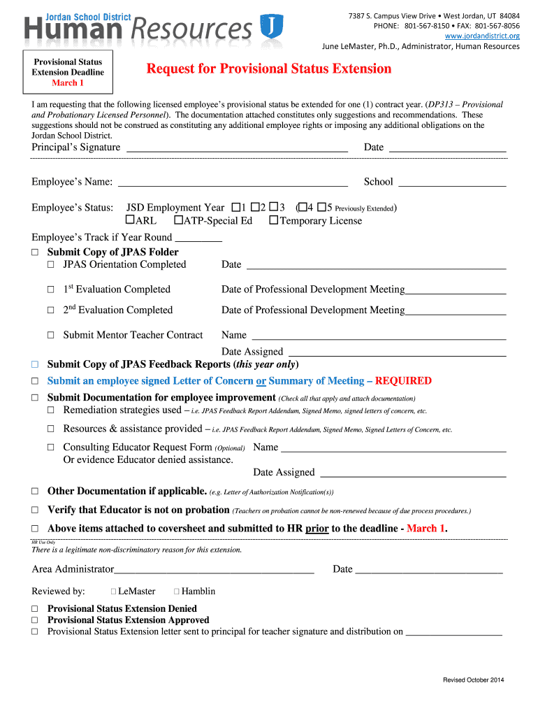 7387 S. Campus View Drive West Jordan, UT 84084 PHONE: 8015678150 FAX: 8015678056 www.jordandistrict.org June Remaster, Ph.D., Administrator, Human Resources Provisional Status Extension Deadline