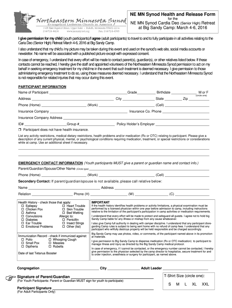 NE MN Synod Health and Release Form for the NE MN Synod Cardiac Do (Senior High) Retreat at Big Sandy Camp: March 46, 2016 I give permission for my child (youth participants)/I agree (adult participants)