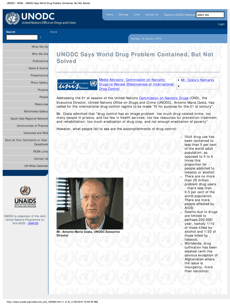 UNODC ROSA UNODC Says World Drug Problem Contained, But Not Solved Home Sitemap Links Contact Us Regional UNODC Websites select site Login Search Home Monday, 25 January 2010 What We Do Who We Are