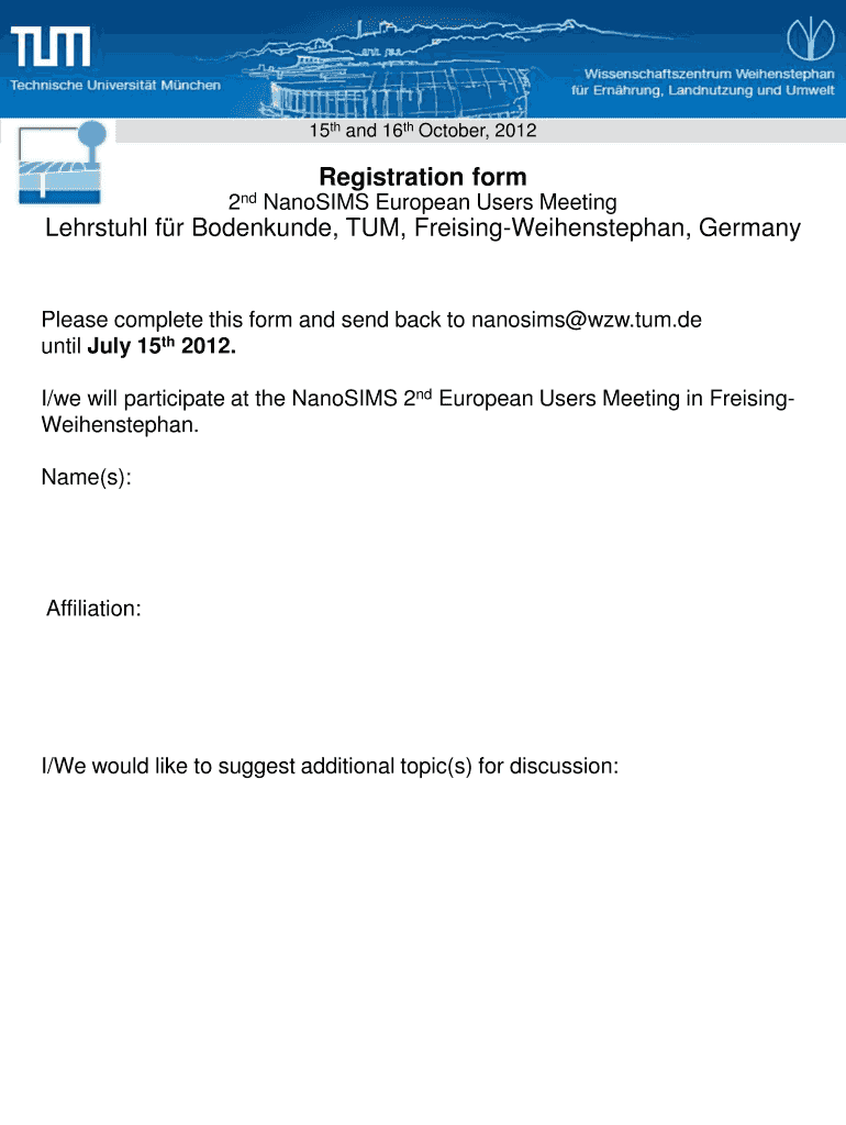15th and 16th October 2012 Registration form 2nd Nanoohms European Users Meeting Lehrstuhl for Bodenkunde, TUM, FreisingWeihenstephan, Germany Please complete this form and send back to nanoohms wow.tum.DE