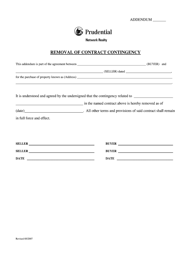 ADDENDUM REMOVAL OF CONTRACT CONTINGENCY This addendum is part of the agreement between (BUYER) and (SELLER) dated, for the purchase of property known as (Address). It is understood and agreed by