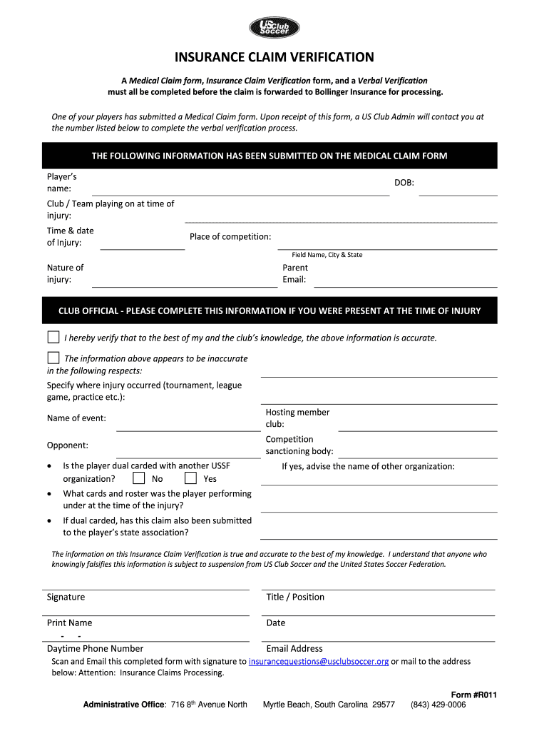 INSURANCE CLAIM VERIFICATION A Medical Claim form, Insurance Claim Verification form, and a Verbal Verification must all be completed before the claim is forwarded to Bollinger Insurance for processing.