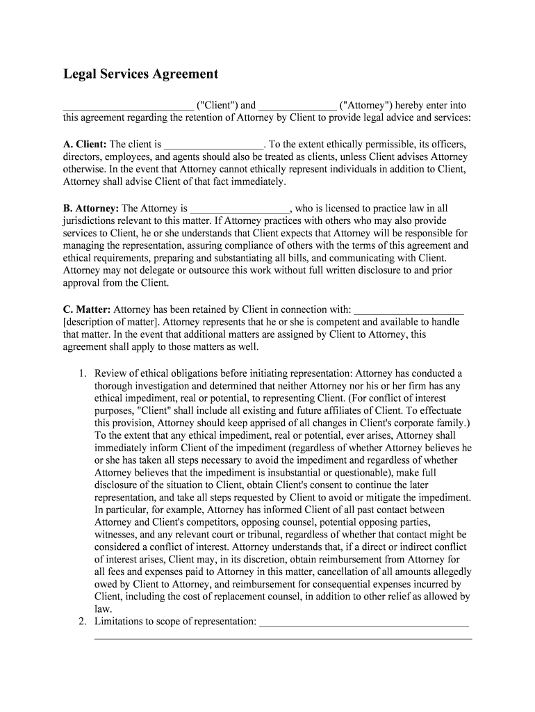 Legal Services Agreement (“Client “) and (“Attorney “) hereby enter into this agreement regarding the retention of Attorney by Client to provide legal advice and services: A. Client: The client