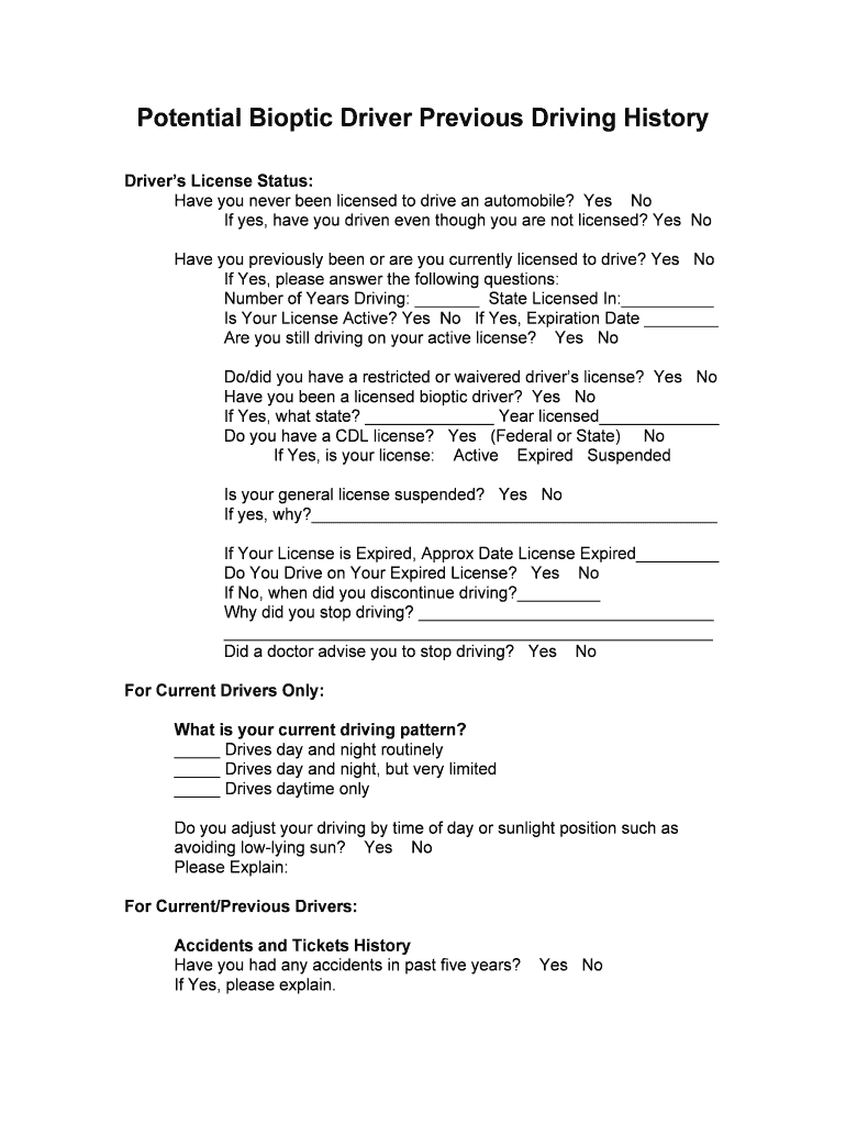 Get the free Potential Bioptic Driver Previous Driving History