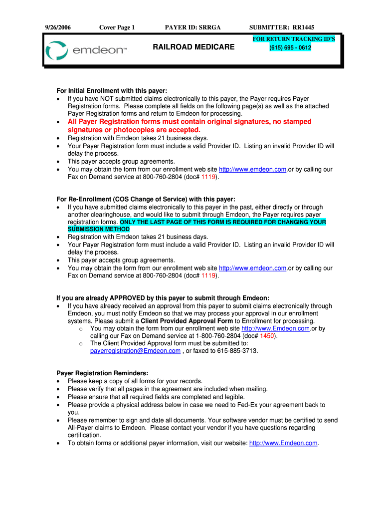 9×26/2006 Cover Page 1 PAYER ID: SYRIA RAILROAD MEDICARE SUBMITTER: RR1445 FOR RETURN TRACKING IDS (615× 695 0612 For Initial Enrollment with this payer: If you have NOT submitted claims electronically