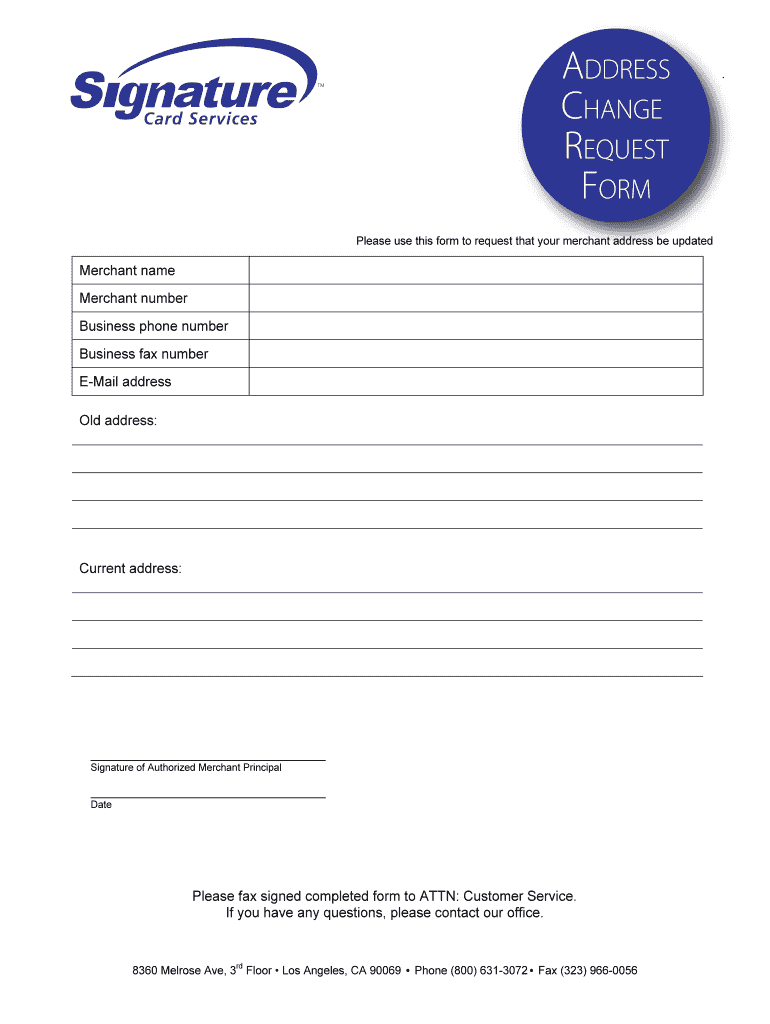 The form can be filled out by authorized merchant principals who are responsible for managing business account details and address changes.