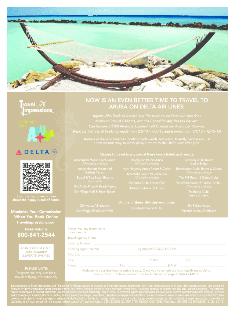 NOW IS AN EVEN BETTER TIME TO TRAVEL TO ARUBA ON DELTA AIR LINES! Agents Who Book an Inclusive Trip to Aruba on Delta Air Lines for a Minimum Stay of 6 Nights, with the Cancel for Any Reason Waiver×,