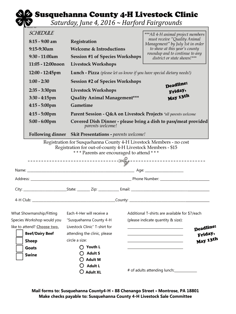 Susquehanna County 4H Livestock Clinic Saturday, June 4, 2016, Hartford Fairgrounds Schedule 9:30 11:00am ***All 4H animal project members must receive Quality Animal Registration Management by July