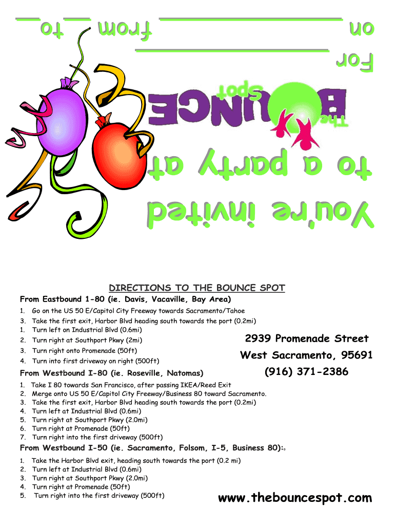 For on from to You're invited to a party at to a party at DIRECTIONS TO THE BOUNCE SPOT From Eastbound 180 (i.e. Davis, Vacaville, Bay Area) 1. Go on the US 50 E×Capitol City Freeway towards Sacramento×Tahoe