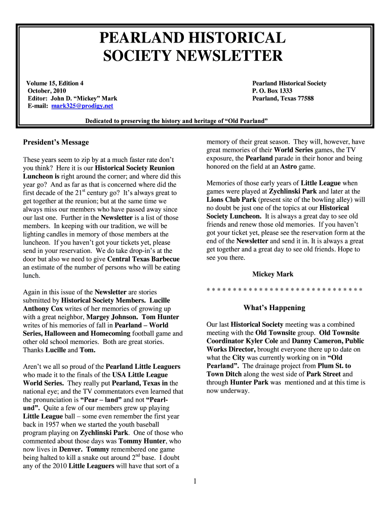 PEARLAND HISTORICAL SOCIETY NEWSLETTER Volume 15, Edition 4 October 2010 Editor: John D. Mickey Mark Email: mark325 prodigy.net Pearland Historical Society P. O. Box 1333 Pearland, Texas 77588 Dedicated