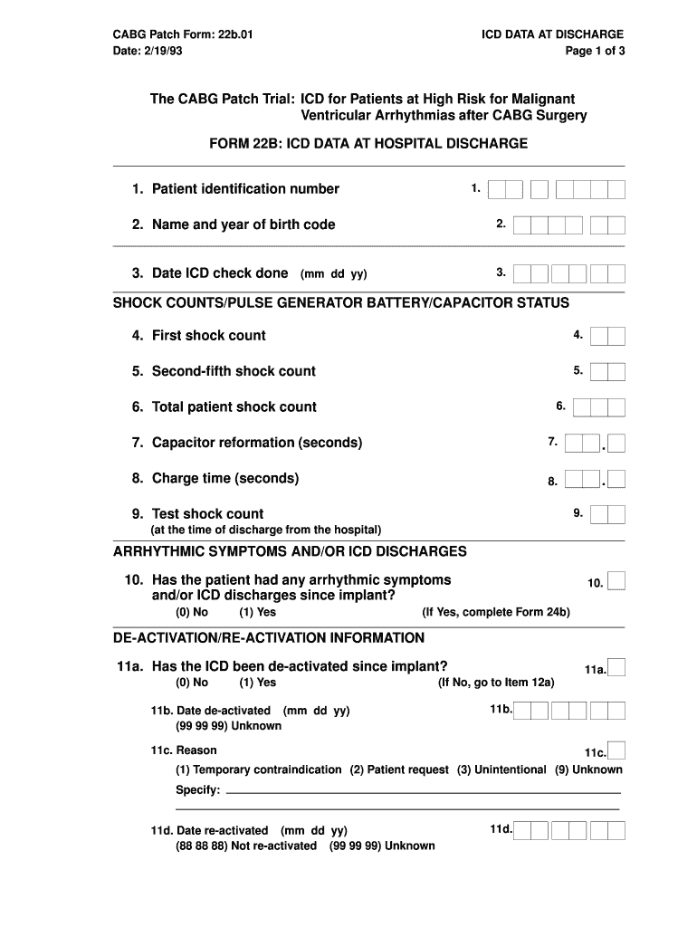 CABG Patch Form: 22b.01 Date: 2×19/93 ICD DATA AT DISCHARGE Page 1 of 3 The CABG Patch Trial: ICD for Patients at High Risk for Malignant Ventricular Arrhythmias after CABG Surgery FORM 22B: ICD