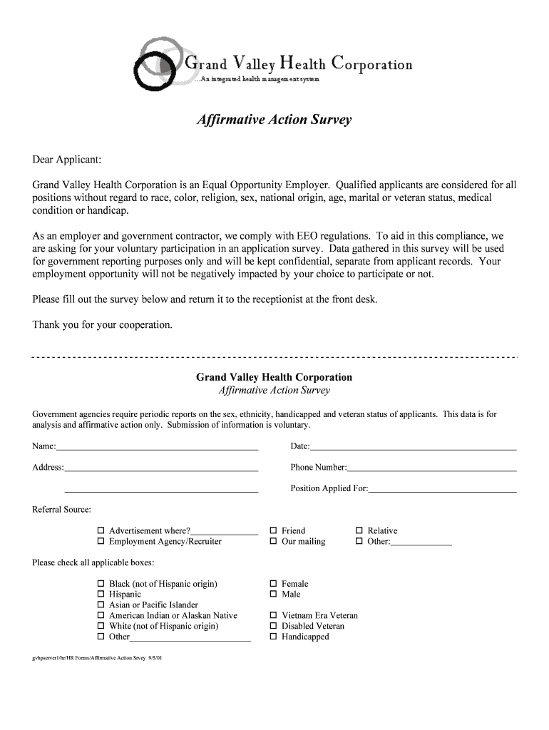 The Affirmative Action Survey is an employment application form used by Grand Valley Health Corporation to collect voluntary demographic data for EEO compliance.
