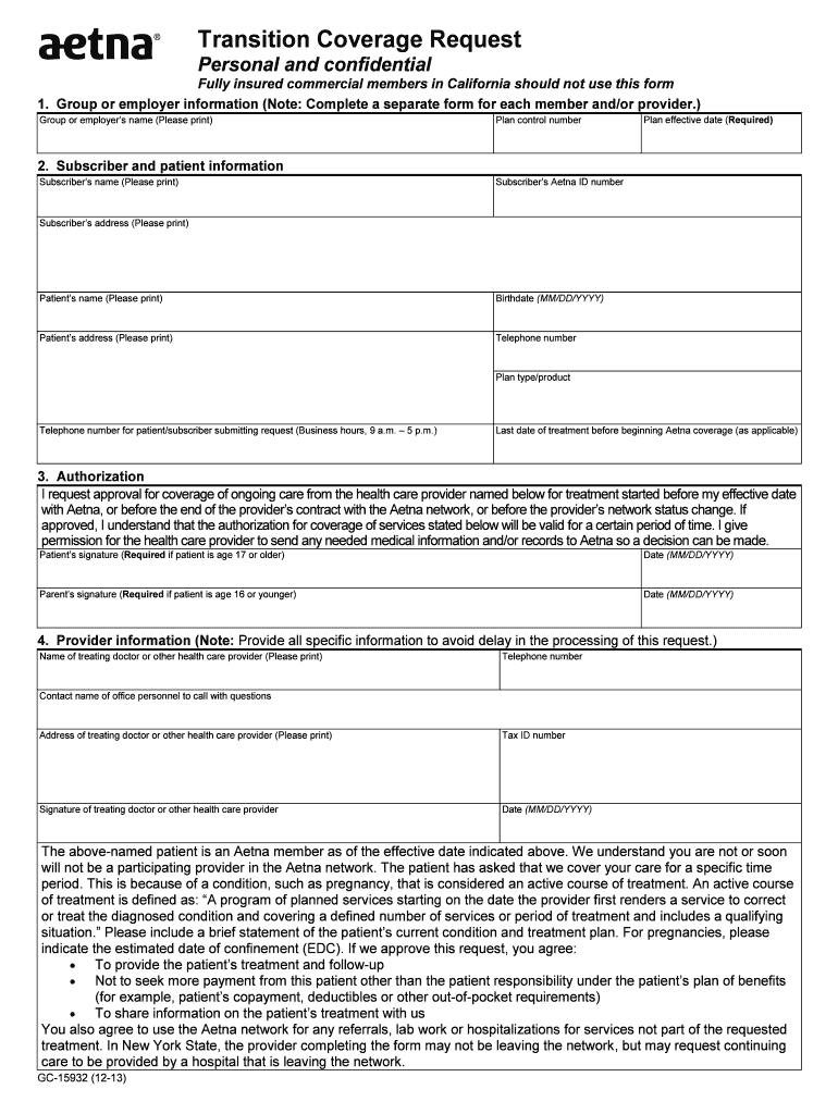 Transition Coverage Request Personal and confidential Fully insured commercial members in California should not use this form On the other side of this form, you'll find answers to commonly asked