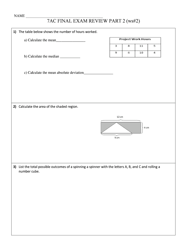 NAME 7AC FINAL EXAM REVIEW PART 2 (WS×2) 1) The table below shows the number of hours worked. A) Calculate the mean b) Calculate the median c) Calculate the mean absolute deviation 2) Calculate the