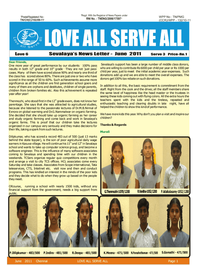 Regd. With the Registrar of News Papers underPostal Registered No : TN/CH(C)/102/0911WPP No : TN/PMG (CCR)/WPP 132/1011RNI No. : TNENG/2006/17597LOVE ALL SERVE ALL Sevalayas News Letter June 2011Love