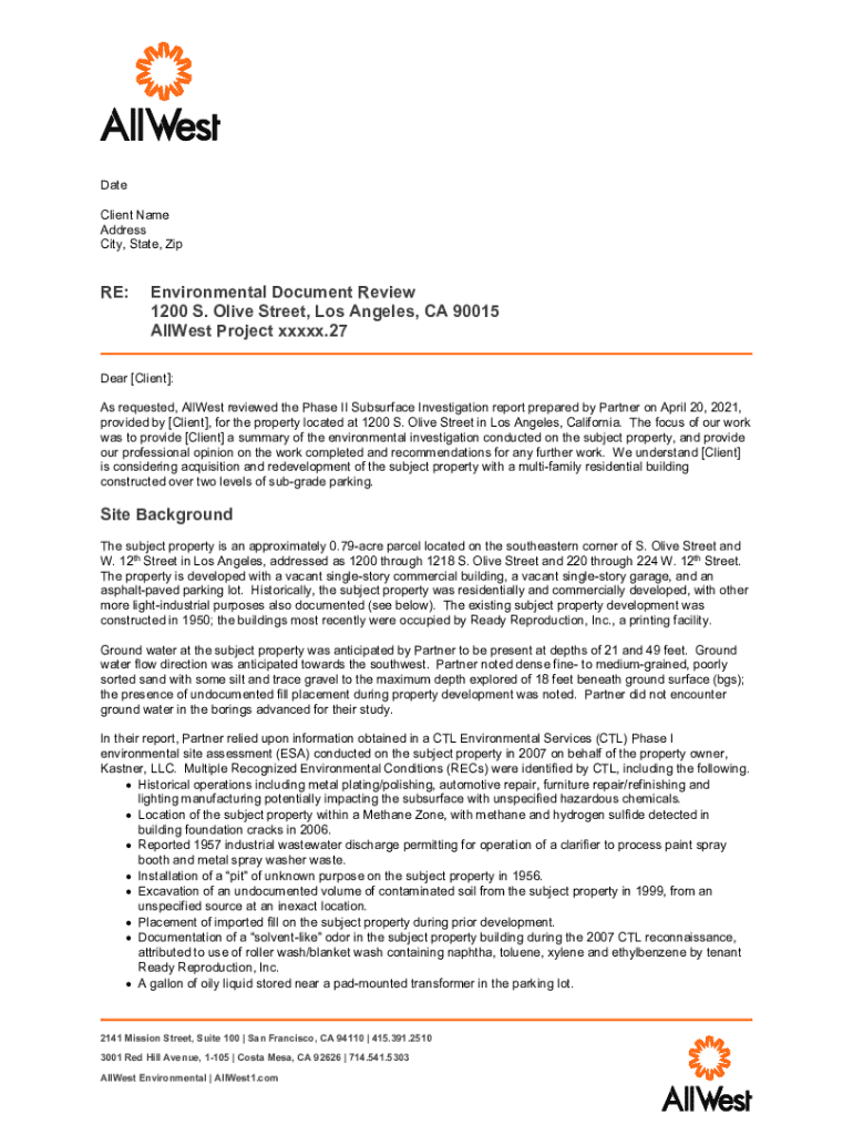 Date Client Name Address City, State, ZipRE:Environmental Document Review 1200 S. Olive Street, Los Angeles, CA 90015 AllWest Project xxxxx.27Dear [Client]: As requested, AllWest reviewed the Phase II Subsurface Investigation report prepared by Partner on April 20, 2021, provided by [Client], for the property located at 1200 S. Olive Street in Los Angeles, California. The focus of our work was to provide [Client] a summary of the environmental investigation conducted on the subject property,