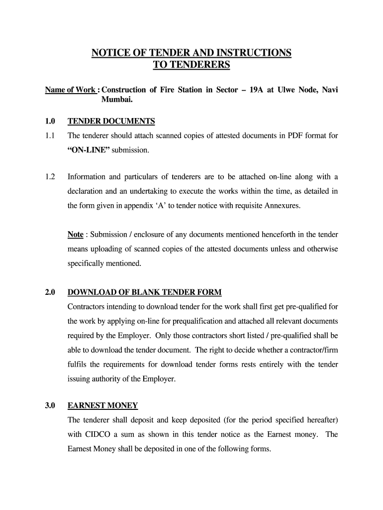 NOTICE OF TENDER AND INSTRUCTIONS TO TENDERER Name of Work : Construction of Fire Station in Sector 19A at We Node, Navi Mumbai. 1.0 TENDER DOCUMENTS 1.1 The tenderer should attach scanned copies