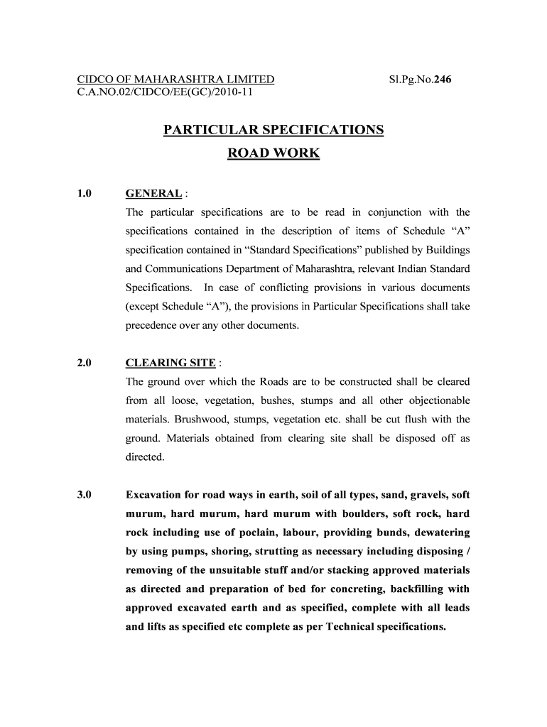 CISCO OF MAHARASHTRA LIMITED C.A.NO.02×CISCO×EE(GC)/201011 SL. Pg. No.246 PARTICULAR SPECIFICATIONS ROAD WORK 1.0 GENERAL : The particular specifications are to be read in conjunction with the specifications