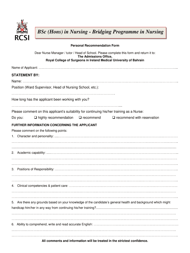 B.Sc. (Hons) in Nursing Bridging Program in Nursing Personal Recommendation Form Dear Nurse Manager / tutor / Head of School. Please complete this form and return it to: The Admissions Office, Royal