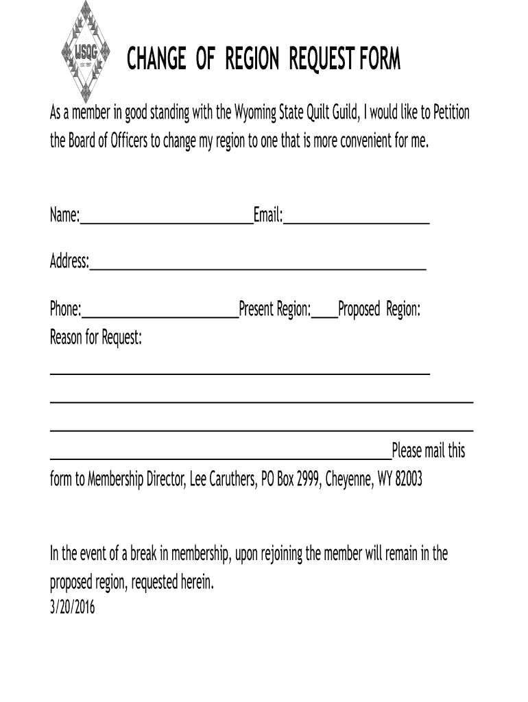 CHANGE OF REGION REQUEST FORM As a member in good standing with the Wyoming State Quilt Guild, I would like to Petition the Board of Officers to change my region to one that is more convenient for