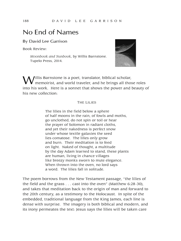David lee garrison188No End of Names By David Lee Garrison Book Review: Moon book and Sun book, by Willis Barn stone. Tupelo Press, 2014. Willis Barn stone is a poet, translator, biblical scholar,