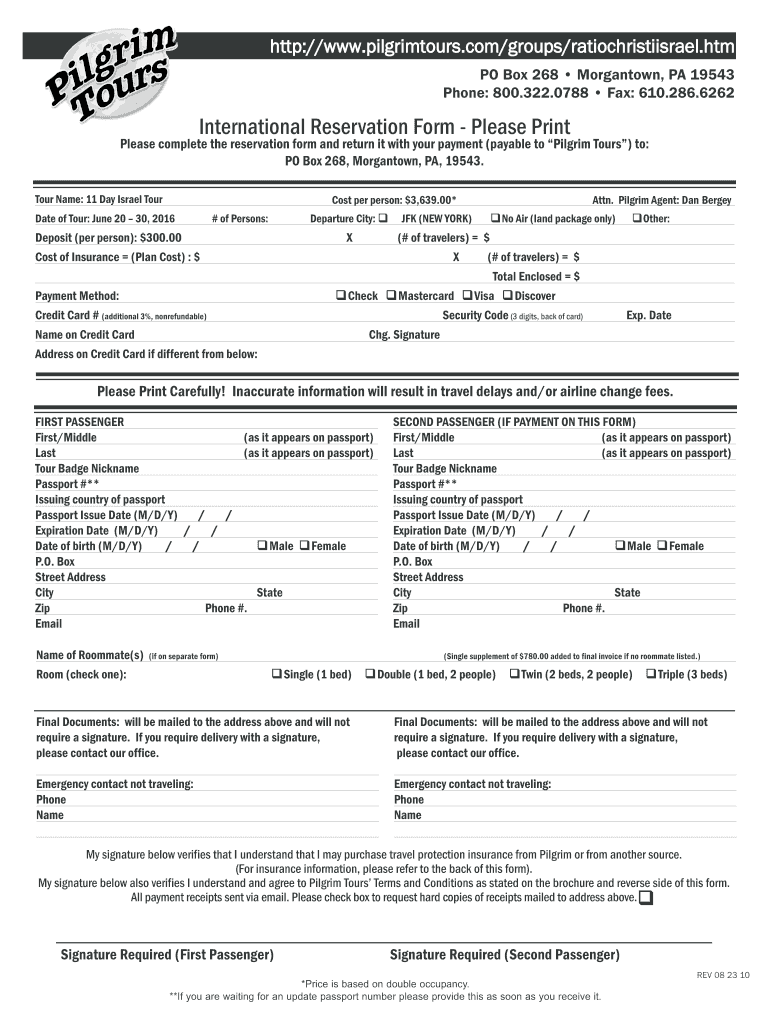 HTTP://www.pilgrimtours.com×groups×ratiochristiisrael.htm PO Box 268 Morgantown, PA 19543 Phone: 800.322.0788 Fax: 610.286.6262 International Reservation Form Please Print Please complete the reservation