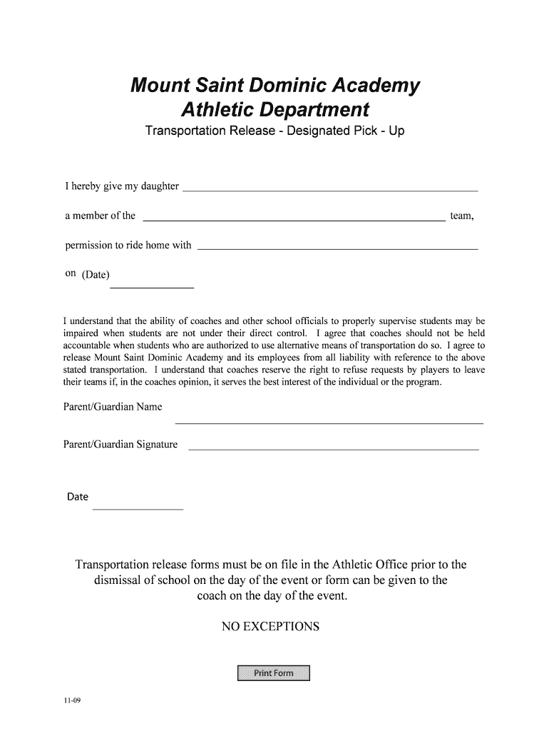 Mount Saint Dominic Academy Athletic Department Transportation Release Designated Pick Up I hereby give my daughter a member of the team, permission to ride home with on (Date) I understand that the
