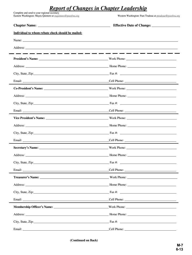 Report of Changes in Chapter Leadership Complete and send to your regional secretary Eastern Washington: Mayra Quintero at Quintero Sofia.org Western Washington: Pam Trudeau at Trudeau Sofia.org Chapter