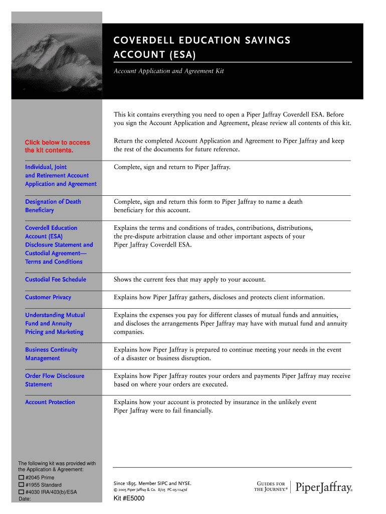 The Coverdell ESA Account Application is a financial form used to open a Coverdell Education Savings Account with Piper Jaffray for funding educational expenses.