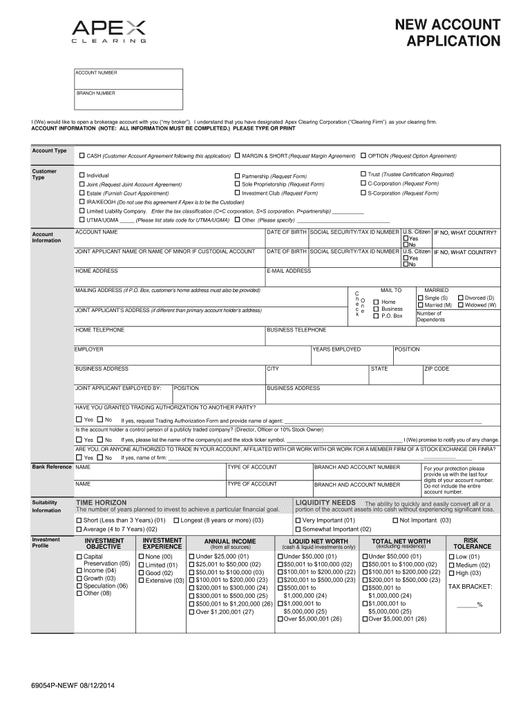 NEW ACCOUNT APPLICATION Reset ACCOUNT NUMBER BRANCH NUMBER I (We) would like to open a brokerage account with you (my broker×. I understand that you have designated Apex Clearing Corporation (Clearing