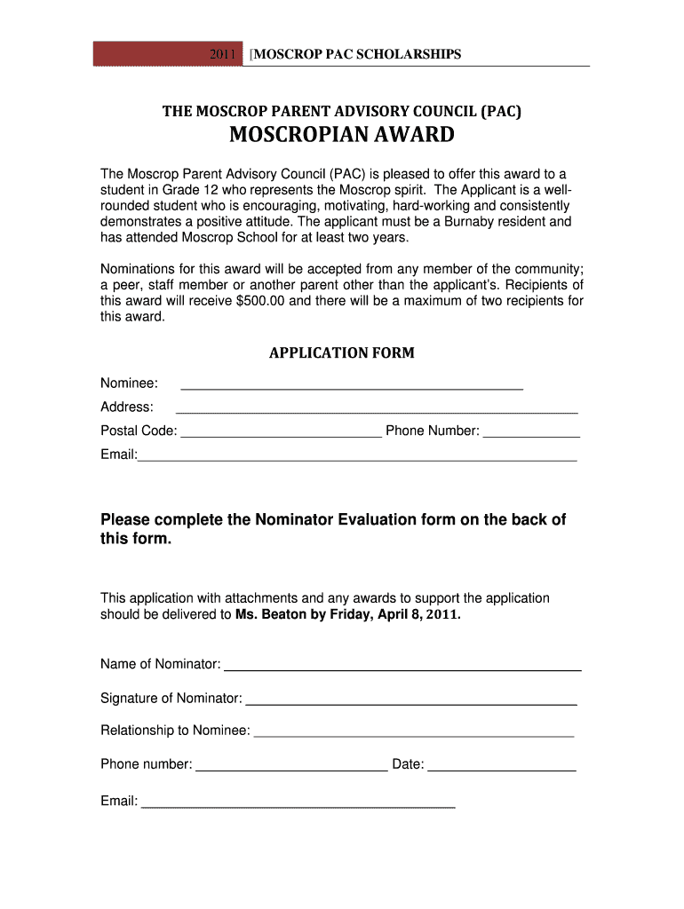 Overall, anyone who wants to be considered for a particular opportunity, recognition, or honor at Moscrop may need to fill out a nomination form. It is important to carefully read the instructions and requirements provided by Moscrop and ensure that all necessary steps are followed to increase the chances of a successful nomination.