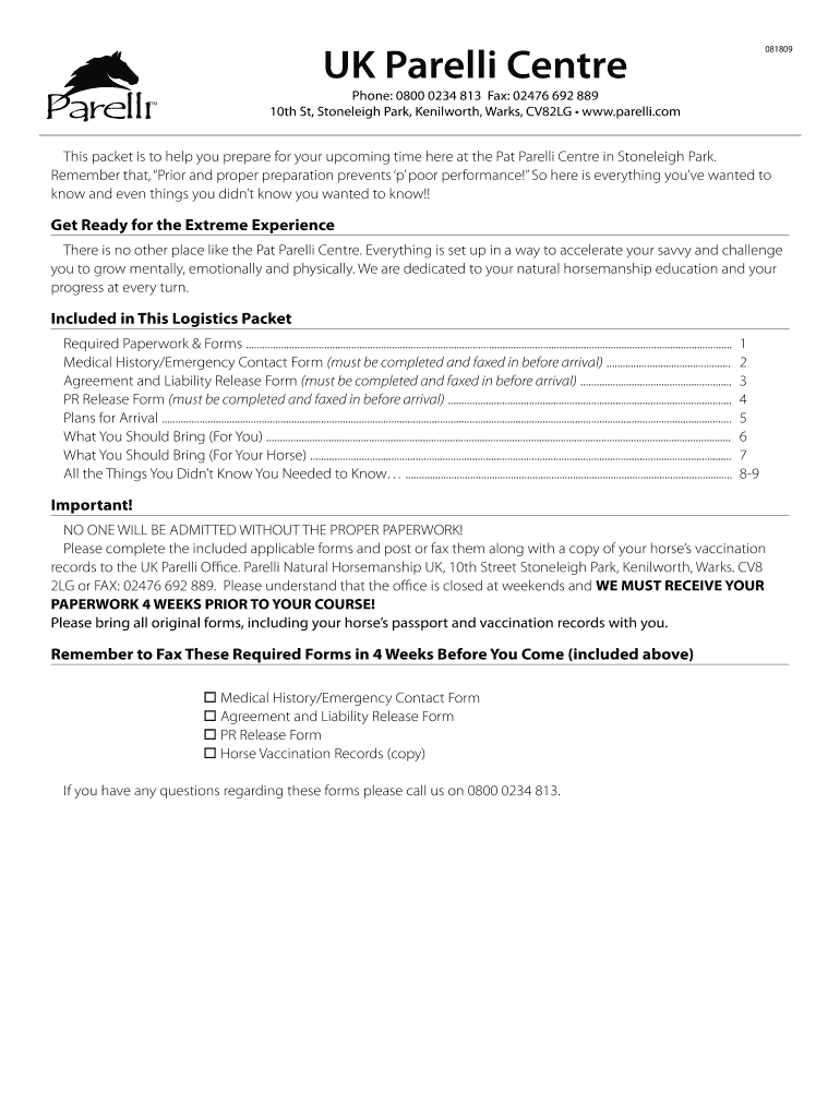UK Pirelli Center TM 081809 Phone: 0800 0234 813 Fax: 02476 692 889 10th St, Stonehenge Park, Kenilworth, Works, CV82LG www.parelli.com This packet is to help you prepare for your upcoming time here