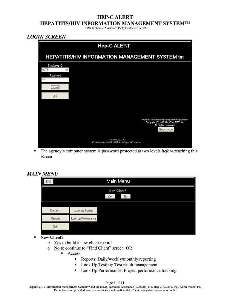 HEPA ALERT HEPATITIS×HIV INFORMATION MANAGEMENT SYSTEM HIMS Technical Assistance Packet: effective 2×1/06 LOGIN SCREEN The agencies' computer system is password protected at two levels before reaching