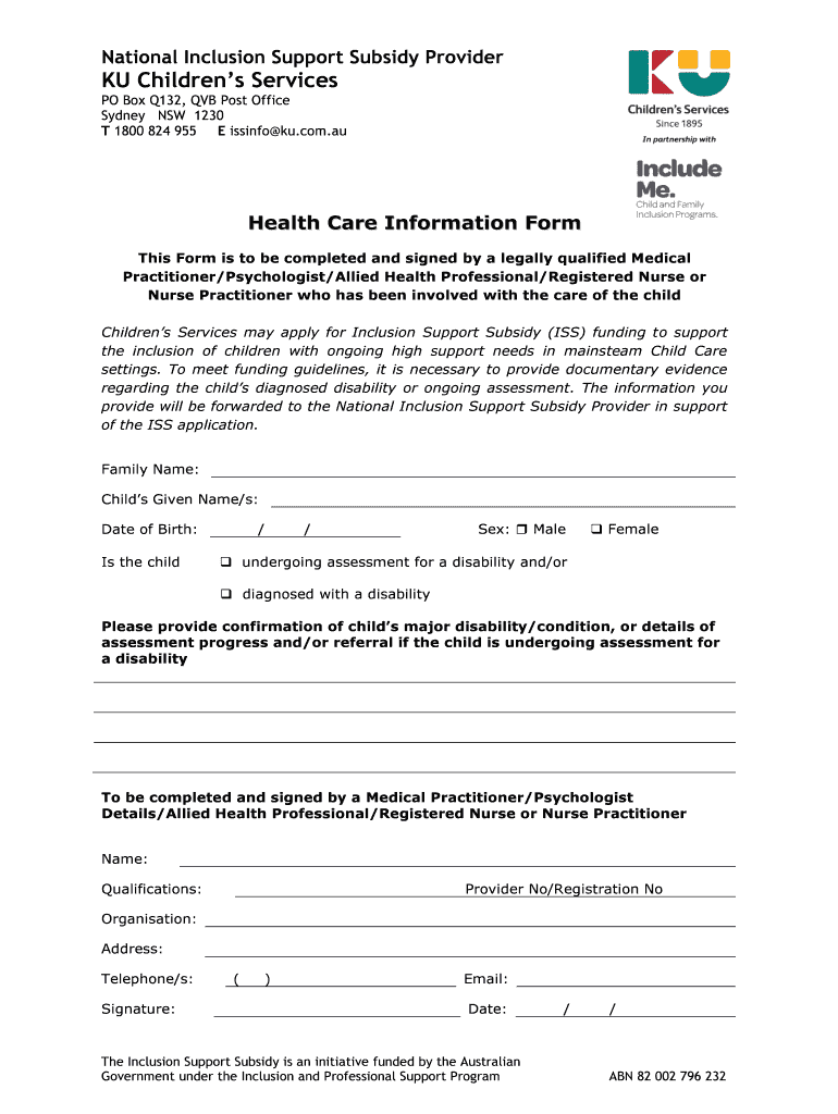 National Inclusion Support Subsidy Provider KU Children's Services PO Box Q132, IVB Post Office Sydney NSW 1230 T 1800 824 955 E missing ku.com.AU Health Care Information Form This Form is to be completed