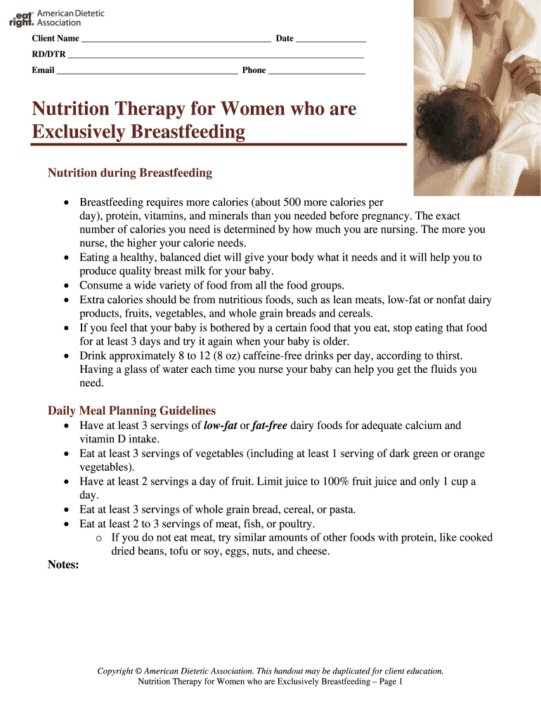 Client Name Date RD×DR Email Phone Nutrition Therapy for Women who are Exclusively Breastfeeding Nutrition during Breastfeeding requires more calories (about 500 more calories per day×, protein,