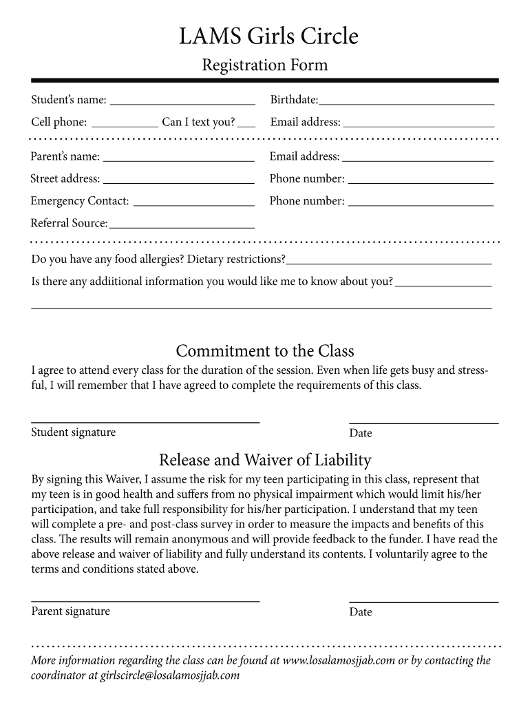 LAMS Girls Circle Registration Form Students name: Birthdate: Cell phone: Can I text you? Email address: Parents name: Email address: Street address: Phone number: Emergency Contact: Phone number:
