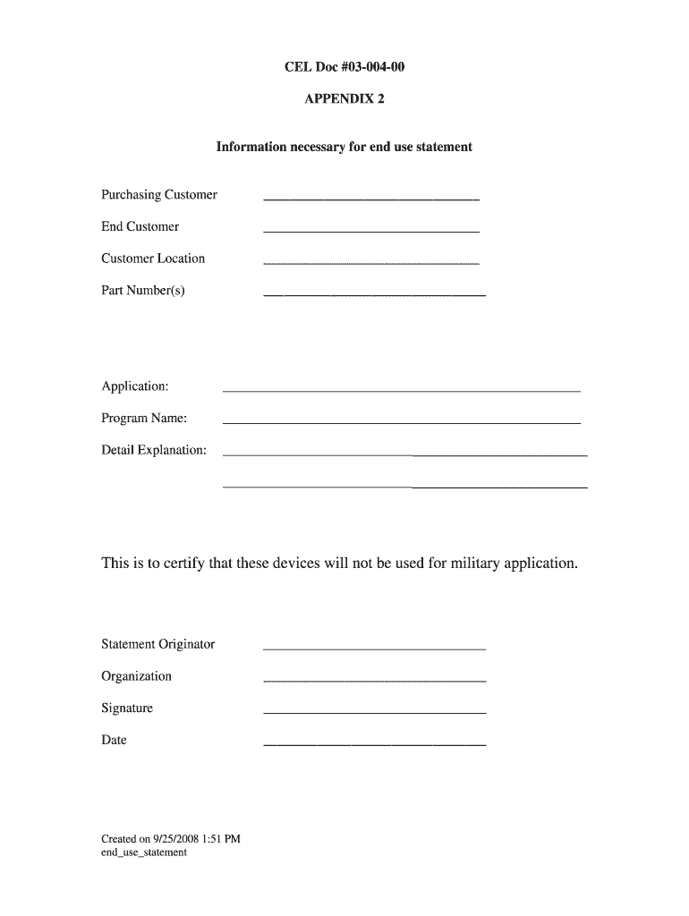 The End Use Statement Certification is a business form used by vendors to certify that purchased devices will not be used for military applications.