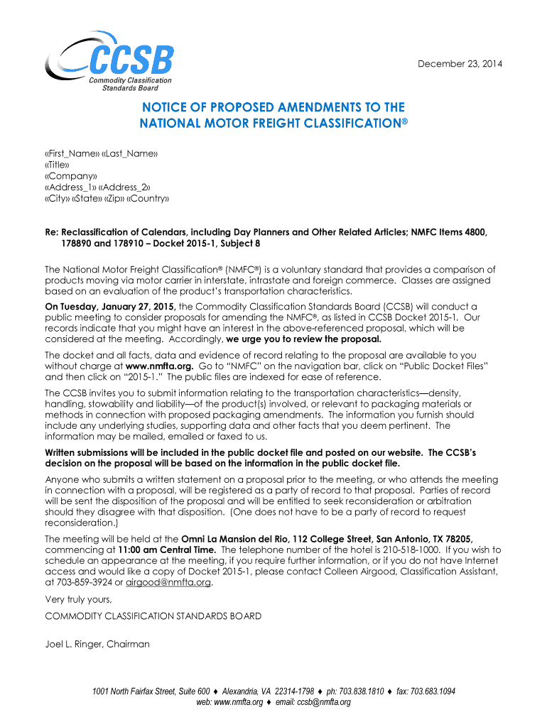 December 23, 2014, NOTICE OF PROPOSED AMENDMENTS TO THE NATIONAL MOTOR FREIGHT CLASSIFICATION First Name Last Name Title Company Address 1 Address 2 City State Zip Country Re: Reclassification of